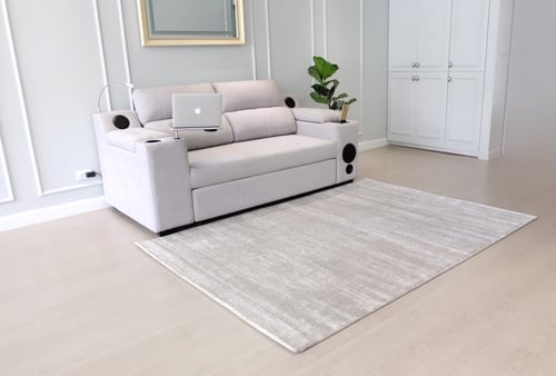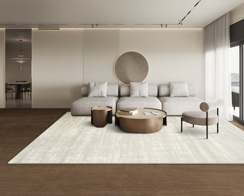 A dense and soft, smooth low pile rug in neutral colors with outstanding handmade appeal.